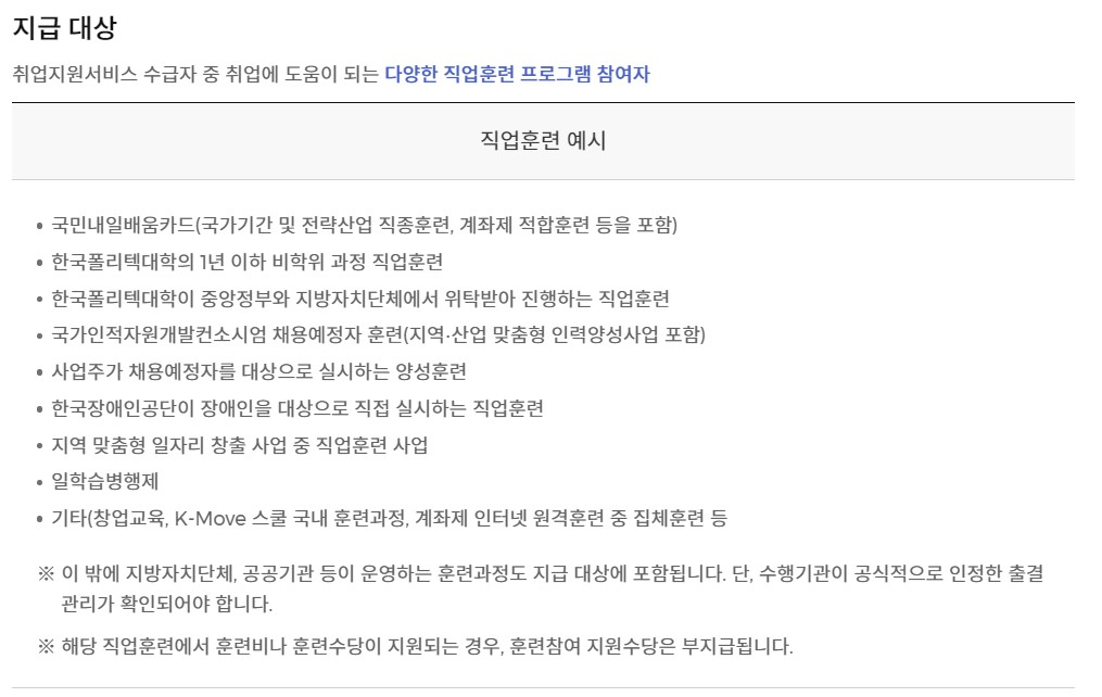 국민취업지원제도 2 유형 수급자 중 취업활동계획에 따라 직업훈련에 참여하고 있는 사람에게 지급하는 수당입니다. 지급대상은 국민내일 배움 카드, 한국폴리텍대한의 1년 이하 비학위과정 또는 정부지원 직업훈련, 한국장애인공단이 장애인을 대상으로 직접 실시하는 훈련등 다양한 직업훈련 프로그램 참여자입니다. 1개월 기준 훈련일 수 1일당 18천 원으로 월 최대 284천 원을 지급받으며 최초훈련개시일 기준 6개월까지 받을 수 있습니다. 훈련참여지원수당 지급 신청서 및 출석인정서류를 제출해야 합니다.