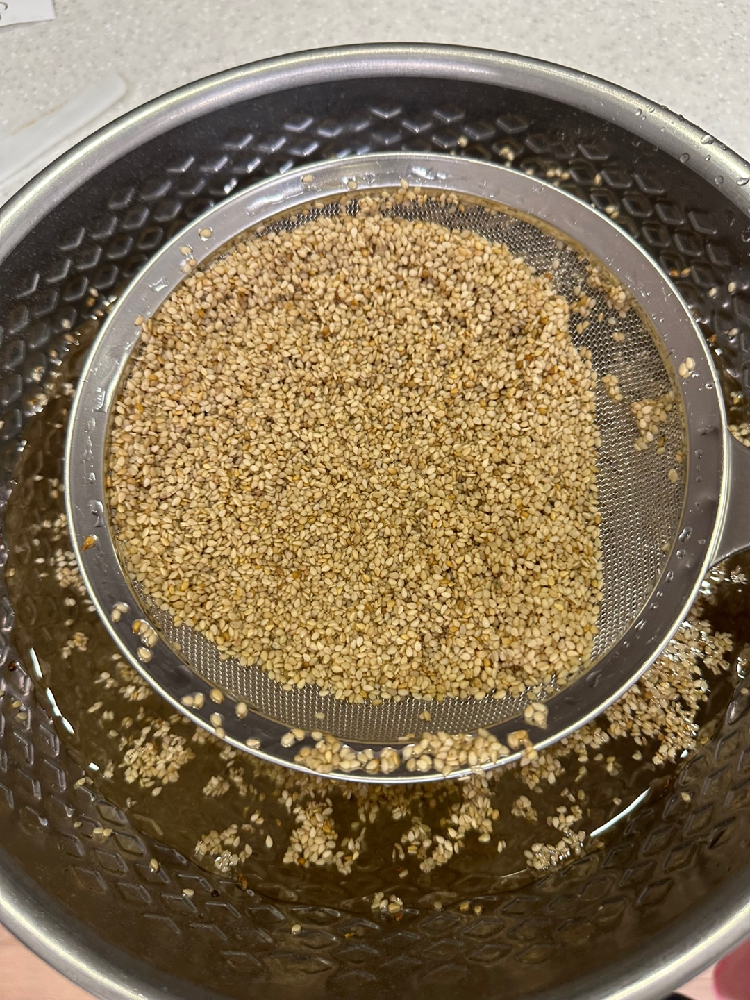 3) 깨를 조리를 통하여 건져서 다른 볼로 이동 시켜줍니다.