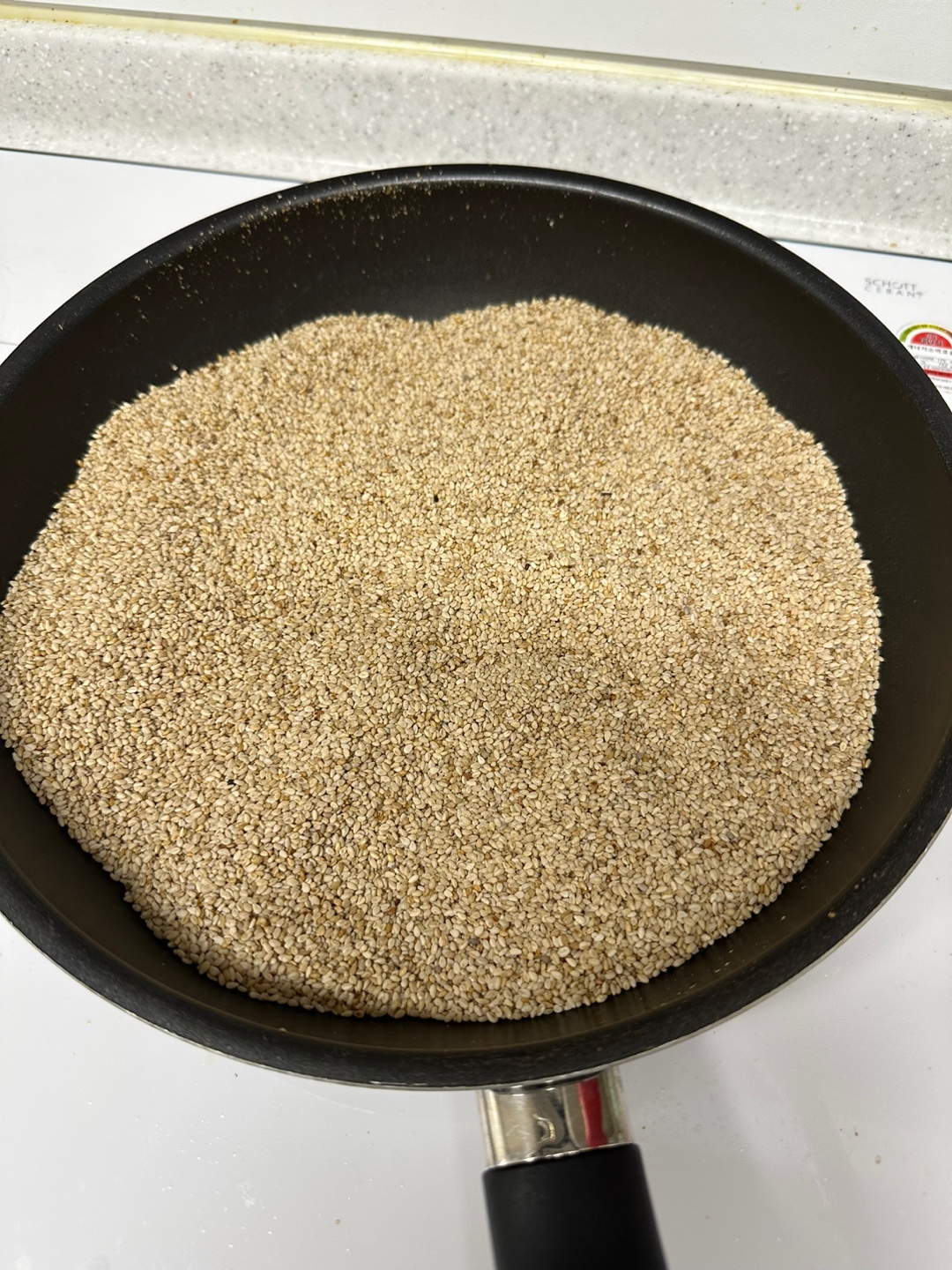 참깨 볶는 법에 대해 알아보겠습니다. 위에서 잘 씻은 참깨는 물기를 다소 제거 한 뒤 프라이팬에 올려줍니다. 가스불이라면 센 불로 하다가 서서히 불조절을 하시면 되며 인덕션의 경우 9로 시작해서 타닥타닥 소리가 나기 시작하면 7, 6으로 낮춰가며 볶아주시다가 물기도 사라지고 타닥거리는 소리도 잦아들고 깨가 노란 금빛이 돌면 다 볶아진 것입니다. 먹었을 때 식감이 톡톡 터져야 합니다. 너무 볶으면 깨가 타서 탄 맛이 날 수 있으니 조심하셔야 합니다.