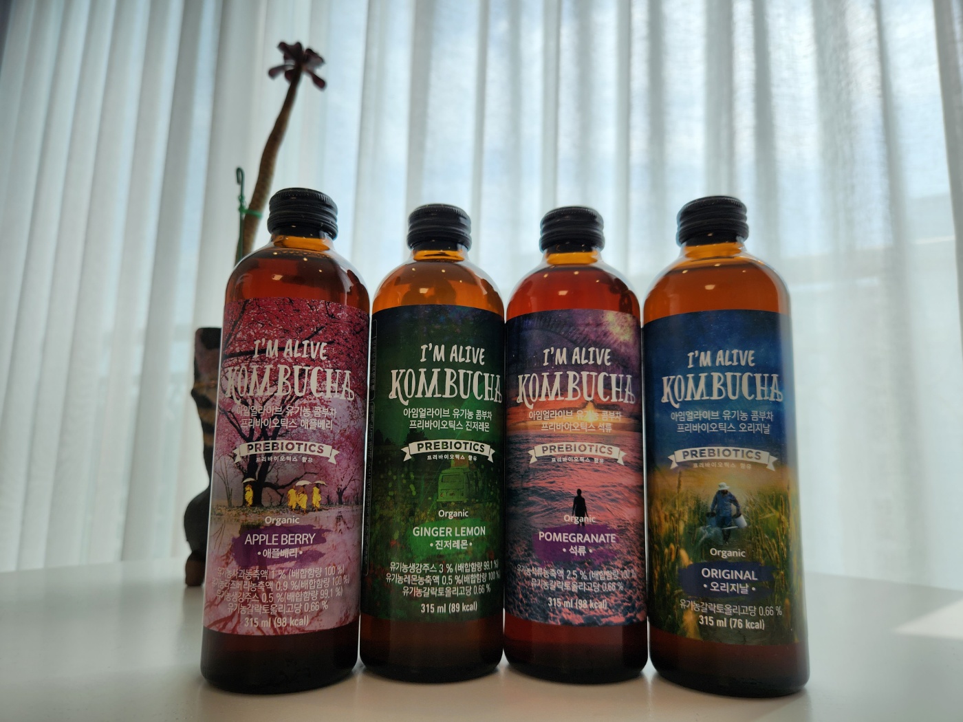 아임얼라이브 콤부차는 세계적인 콤부차 브랜드인 Buchi사의 원천기술에 506시간의 독자적 발효공법으로 탄생한 브랜드라고 합니다. 국내산 제주 오설록 녹차농장의 유기농 녹차와 국내산 유기농 홍차를 이용하여 발효하였고 설탕을 넣지 않고 유기농 사탕수수원당을 이용 유기농 덩어리입니다. 안심하고 먹을 수 있다는 의미지요. 그리고 프리바이오틱스 유산균도 들어있습니다. 그 이 글루쿠론산, 비타민, 미네랄, 아미노산 등 영양소가 들어있다고 합니다. 맛 별로 오리지널, 석류, 진저레몬, 애플베리 등의 맛이 있고 해당 과일의 성분도 들어있어 더 좋습니다.