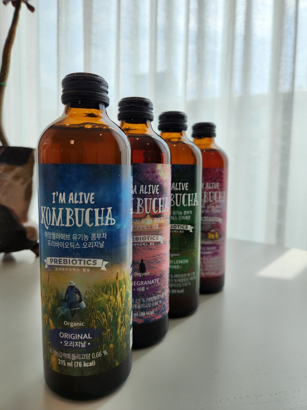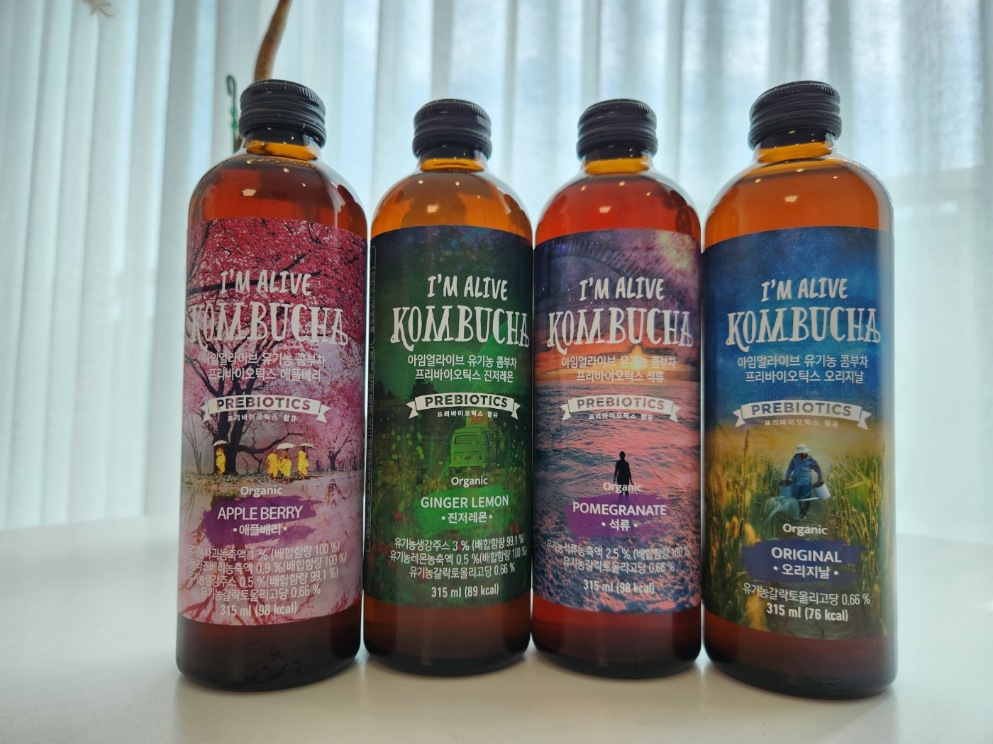 아임얼라이브 콤부차는 세계적인 콤부차 브랜드인 Buchi사의 원천기술에 506시간의 독자적 발효공법으로 탄생한 브랜드라고 합니다. 국내산 제주 오설록 녹차농장의 유기농 녹차와 국내산 유기농 홍차를 이용하여 발효하였고 설탕을 넣지 않고 유기농 사탕수수원당을 이용 유기농 덩어리입니다. 안심하고 먹을 수 있다는 의미지요. 그리고 프리바이오틱스 유산균도 들어있습니다. 그 이 글루쿠론산, 비타민, 미네랄, 아미노산 등 영양소가 들어있다고 합니다. 맛 별로 오리지널, 석류, 진저레몬, 애플베리 등의 맛이 있고 해당 과일의 성분도 들어있어 더 좋습니다.